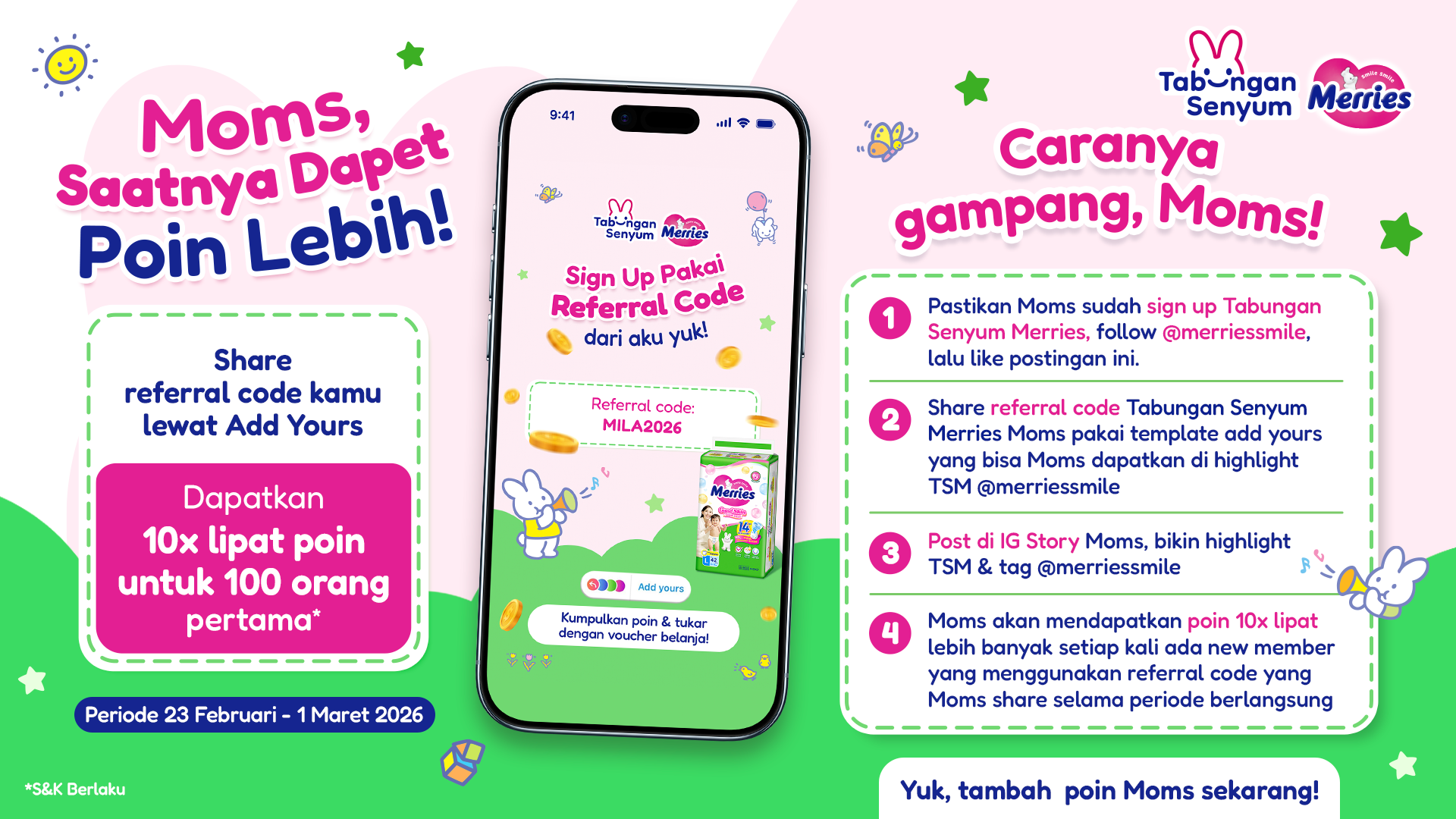 1. Peserta akan mendapatkan poin tambahan sebesar 10 kali lipat untuk setiap anggota baru yang mendaftar Tabungan Senyum Merries menggunakan referral code Peserta selama Periode Activity.